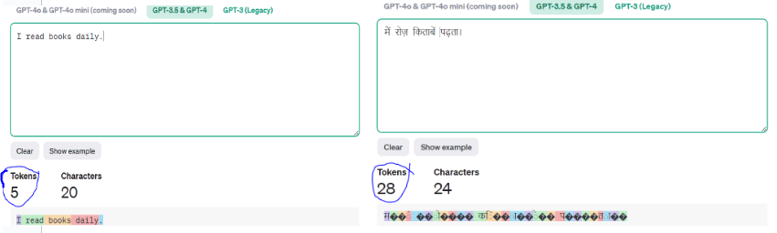For example: I calculated the token count for English vs. Hindi for a similar sentence of four words in the ChatGPT 3.5 model. Following is the result: