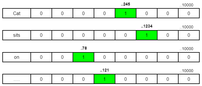 - Now, imagine a vocabulary comprising 10,000 tokens. Each token finds its place within a sprawling matrix, where its position signifies its identity. Technically, these tokens would be represented in below form where their corresponding position will be replaced by 1.
